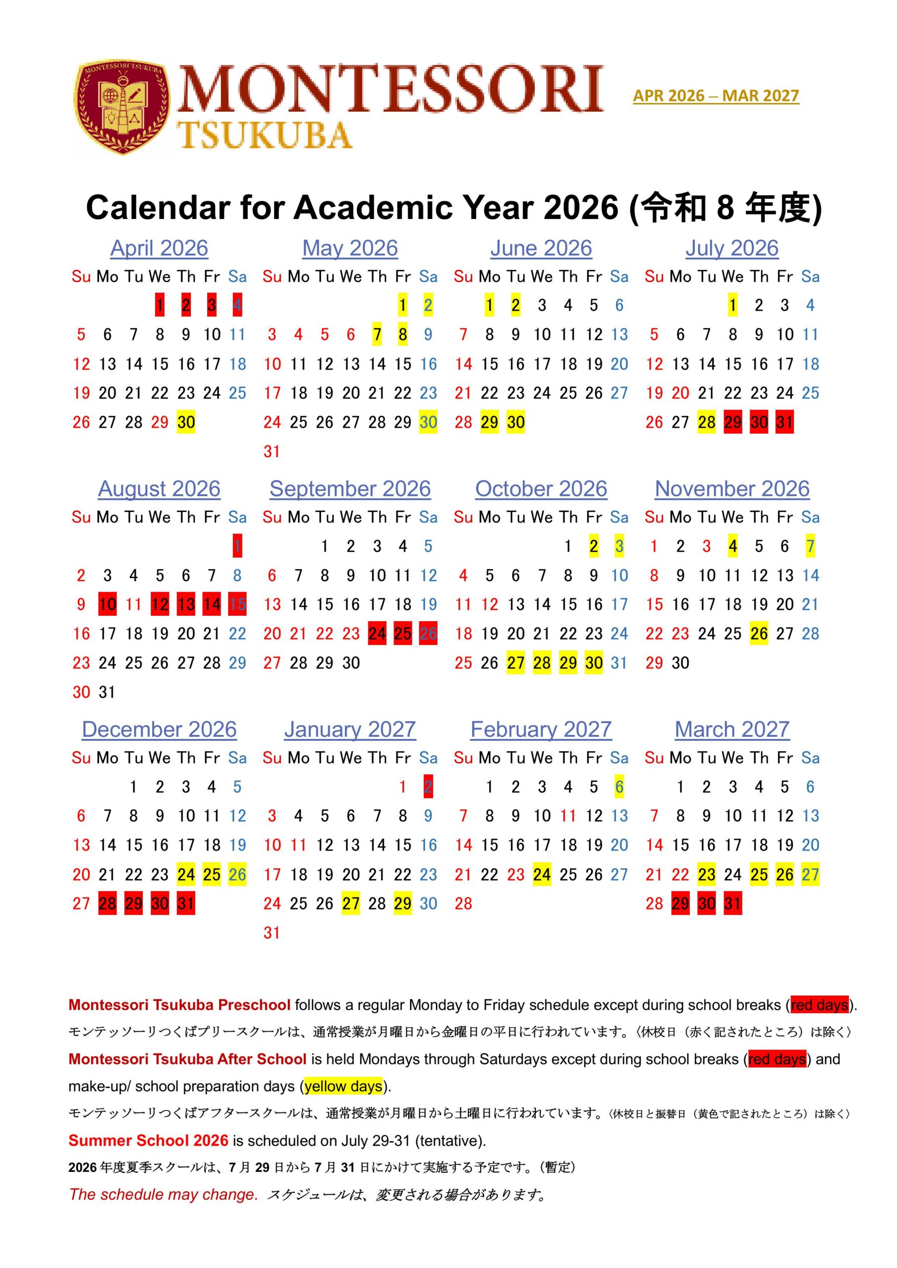 Calendar & Fees Montessori-Tsukuba International Preschool and After School-モンテッソーリつくばインターナショナルスクール(英語教育)-Calendar-Reiwa-8 Montessori Tsukuba Preschool Fees (tax included) Montessori Tsukuba Monthly Tuition Fee Breakdown and Explainer downloadable pdf file (preschool monthly tuition explainer) (6 pages) Montessori Tsukuba Preschool Bus Fees (After School) Monthly Tuition (tax included)After School starts at 14,600 yen (2 hours a week, 3-4 times a month, 40 sessions a year)